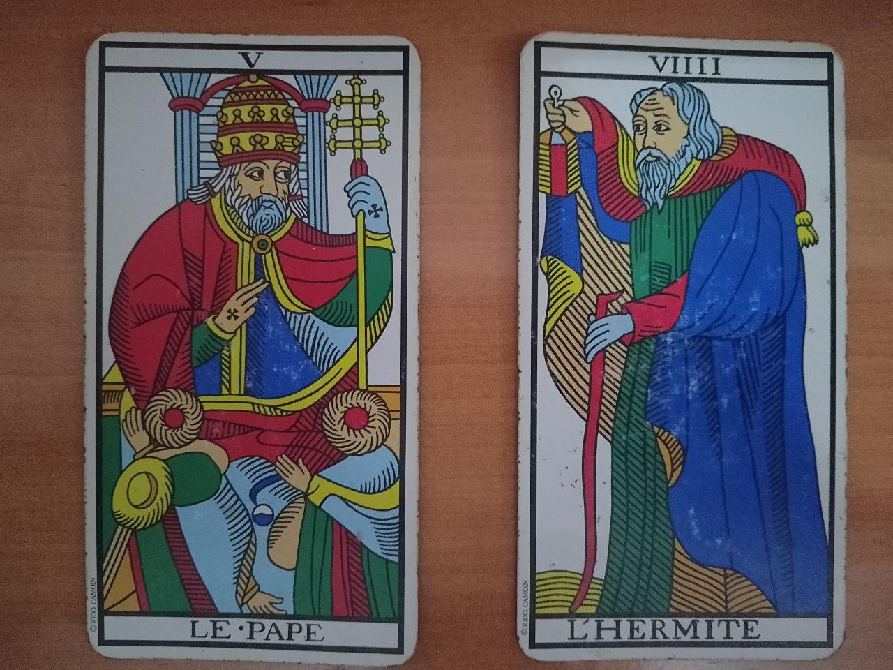 Respecto al Papa y al Ermitaño son la crisis de lo estable (permanente impermanencia). Los dos tienen un guante azul que simboliza la transmisión de conocimiento espiritual y la guía interna. La conexión entre la enseñanza externa (Papa) y la sabiduría interna (Ermitaño).