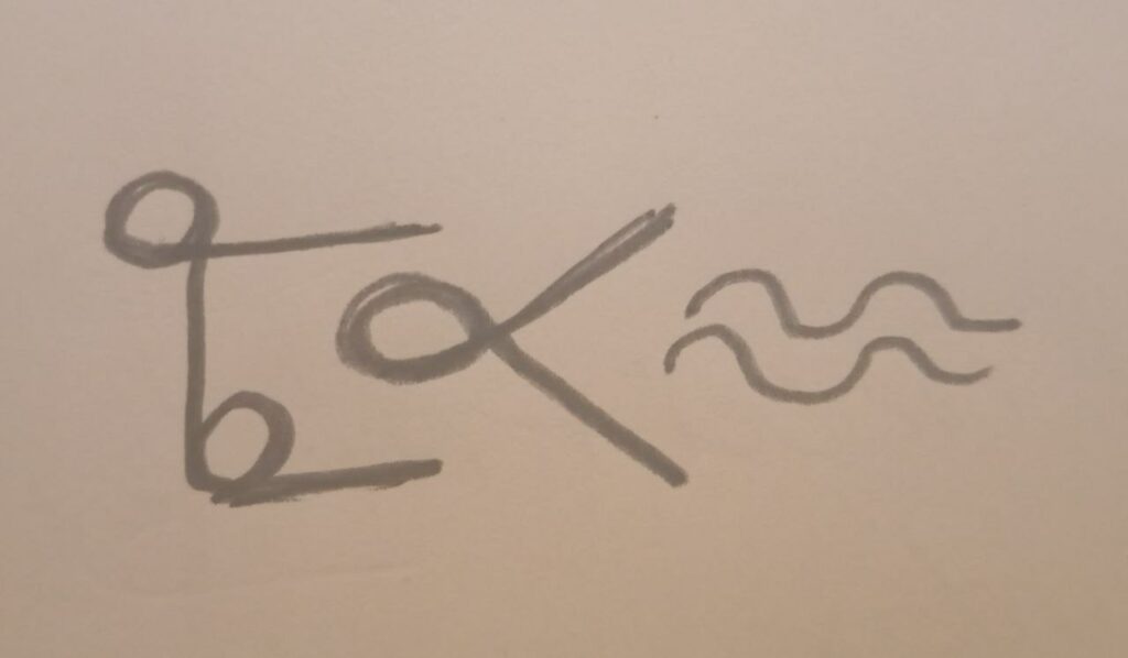 Estoy de pie viendo a la altura de los ojos un grabado en piedra brillante, es una línea como de un palmo de ancha en horizontal, veo el comienzo de los grabados que están encuadrados arriba y abajo, con pequeños símbolos curvos y puntas, y en medio está lo que entiendo es el texto, comienza con la imagen típica de lo que parece un egipcio de las pirámides con peluca y falda de lado, con los brazos flexionados y las palmas de las manos hacia arriba, como el que da u ofrece algo, y a continuación hay unos grabados, solo logro ver con claridad los tres primeros.