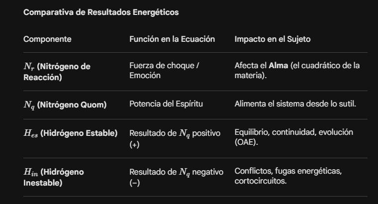 En Nitrógenos (II), los Nr como fuerzas reactivas que influyen en el equilibrio energético que se explica que H representa la energía constante (como el combustible), N la fuerza variable (el catalizador y dirección), y Q la potencia resultante (el poder de proyección, derivado de H × N; Los Nr son directamente proporcionales a Q: a mayor Q (potencia), mayor fuerza N, lo que genera un H positivo y estable; a menor Q, menor fuerza, resultando en H inestable que puede llevar a desequilibrios como conflictos o estancamientos.